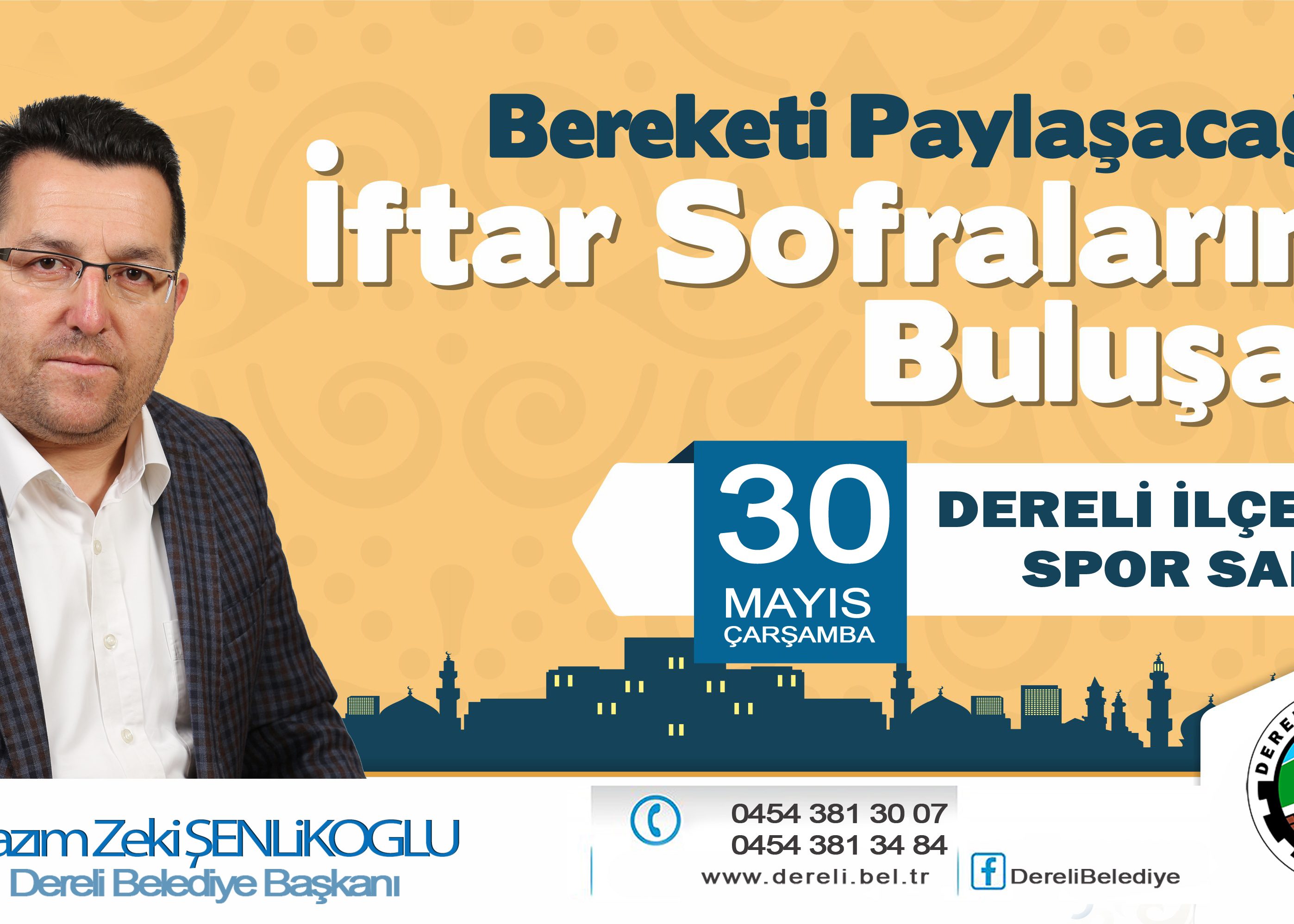 Belediyemizce 30 Mayıs 2018 Çarşamba günü Dereli İlçe Kapalı Spor Salonu’nda toplu iftar yemeği düzenlenecektir. Saat 18:00’dan itibaren ramazan eğlencesi ile başlayacak olan iftar programımıza tüm halkımız davetlidir. 29/05/2018 Dereli Belediyesi